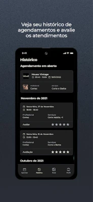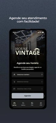 Através do App House Vintage os clientes podem realizar seus agendamentos de uma forma muito mais prática. Na tela inicial, é possível selecionar os serviços e horário desejado para seu próximo atendimento. Já na tela de histórico, você poderá confirmar ou cancelar seus agendamentos. É possível também na tela do perfil o cliente editar suas informações, como e-mail, foto de perfil e telefone.